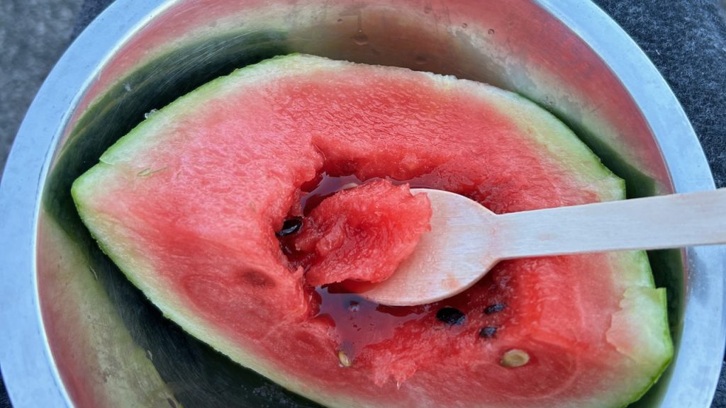 もうね、目の前のスイカも瑞々しくて真っ赤で美味しそうなんだけど、こういうのはその気持ちがね、私が暑い思いをして喉が乾いとるやろうと思って、スイカを切ってボウルに入れて、さらにスプーンと一緒に箱に入れて、わざわざ自宅から持ってきてくださった、何よりもその行動の後ろにある気持ちに直面して、本当にありがたくてね…、からっきし弱いんですわ、こういうのは。