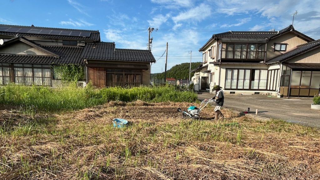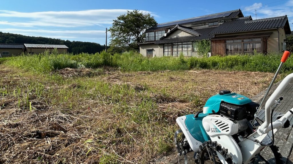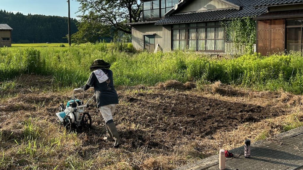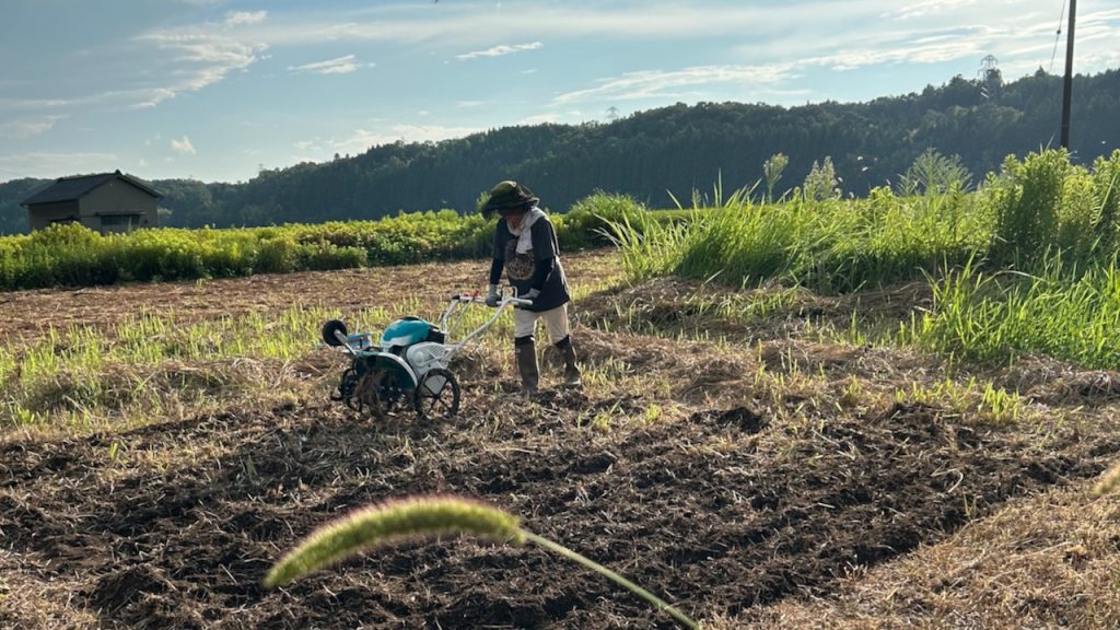 ピロール資材も撒き終えて、次は管理機での土起こしです。