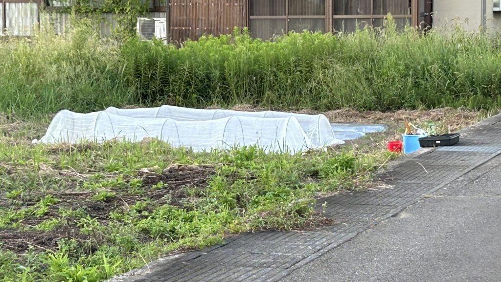 畝の表面は、草が生え始めてマルチを突き破って顔を出してるところもありましたが、パッパと取って平らにして、水撒きの後にまたマルチを被せました。
