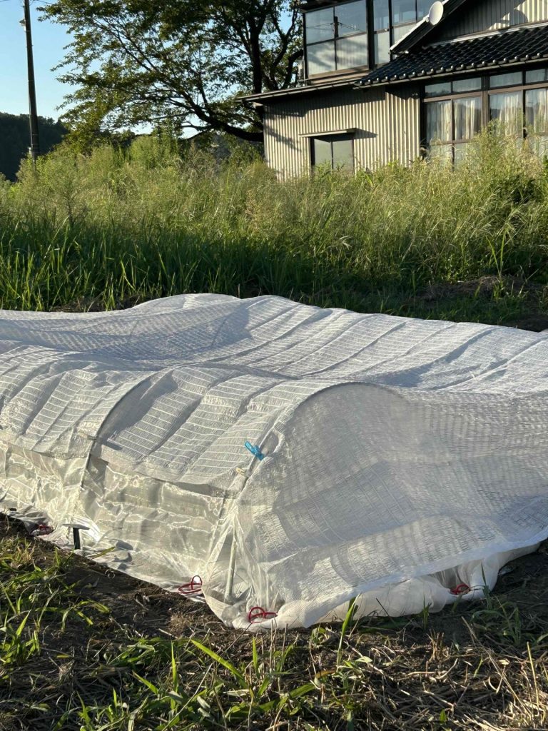 その上に、アーチ型の支柱と防虫ネットでカバーしました。